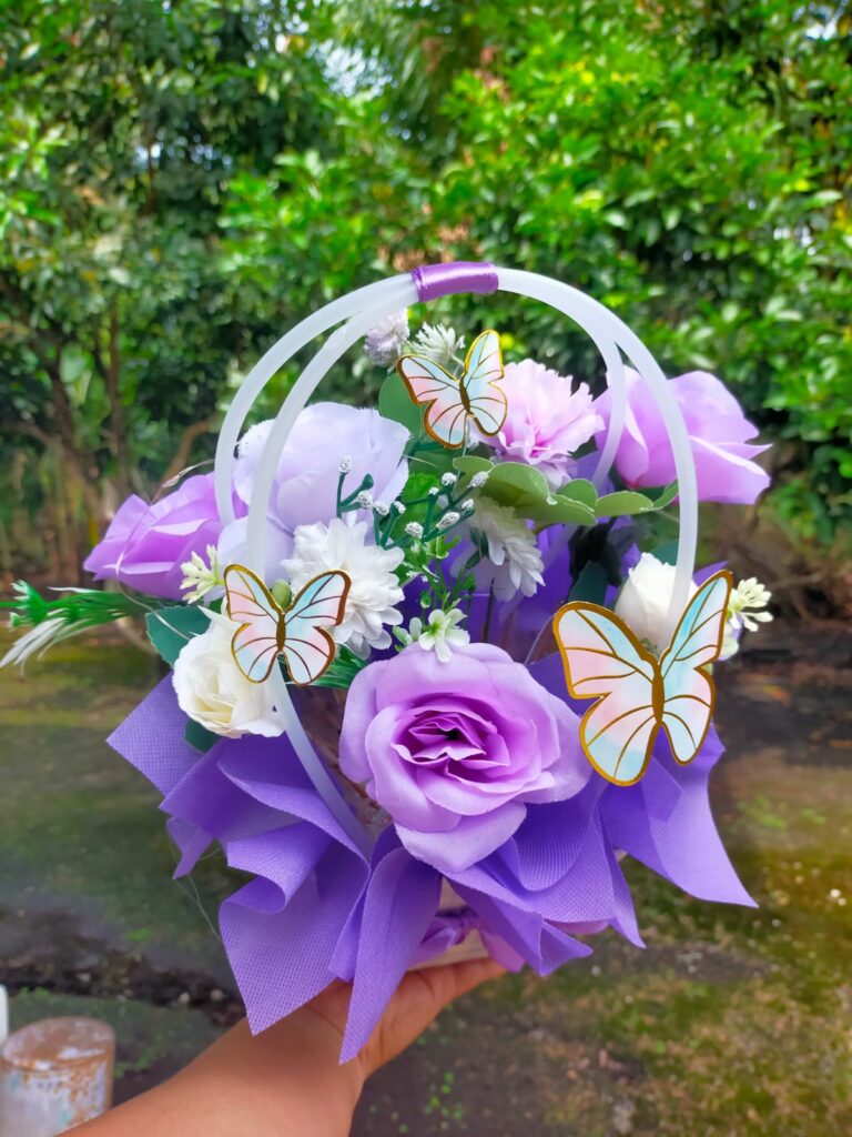 karangan tangan. biasanya berisi bunga segar atau bunga atifical yang di bungkus