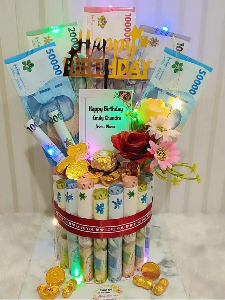 Bucket Money merupakan bucket unik yang di susun dari lembaran uang asli yang di rangkai menyerupai bunga atau ornamen dekoratif. biasanya di berikan sebagai